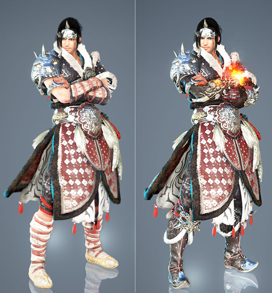 ▲ (좌) [무사] 서련방 갑옷을 착용한 상태 / (우) [무사] 서련방 갑옷, 장갑, 신발을 착용한 상태