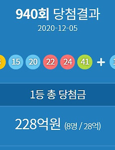 . [동행복권 로또] 20201205 940회 당첨번호 및 결과, 수령액, 판매점안내, 당첨금 수령방법 안녕하세요. 2020년 12월 5일 940회 동행복권 나눔로또의 1등 당첨자는 8명으로 28억씩 !! 가져가게 되었네요. *자료출처 - 동행복권 공식 홈페이지 | 로또는 숫자 몇개가 맞아야 당첨인가? 5등 : 숫자 3개 일치 4등 : 숫자 4개 일치 (4등까지는 세금 없음) 3등 : 숫자 5개 일치 2등 : 숫자 5개와 + 보너스 번호 1등 : 보너스를 제외한 6자리 수 모두 일치 940 회차 나눔로또 당첨결과 총 판매금액은 939억원! . . . . 3, 15, 20, 22, 24, 41 보너스 11 940 회차 나눔로또 당첨 판매점 이번 회차는 부산, 안양, 하남화성, 충주, 전주, 구미에서 1등이..