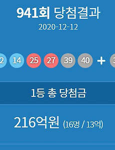 . [동행복권 로또] 20201212 941회 당첨번호 및 결과, 수령액, 판매점안내, 당첨금 수령방법 안녕하세요. 2020년 12월 12일 941회 동행복권 나눔로또의 1등 당첨자는 16명으로 13억씩 !! 가져가게 되었네요. *자료출처 - 동행복권 공식 홈페이지 | 로또는 숫자 몇개가 맞아야 당첨인가? 5등 : 숫자 3개 일치 4등 : 숫자 4개 일치 (4등까지는 세금 없음) 3등 : 숫자 5개 일치 2등 : 숫자 5개와 + 보너스 번호 1등 : 보너스를 제외한 6자리 수 모두 일치 941 회차 나눔로또 당첨결과 총 판매금액은 948 억원! . . . . 12, 14, 25, 27, 39, 40 보너스 35 941 회차 나눔로또 당첨 판매점 이번 회차는 서울, 부산, 대구광주, 대전, 남양, 부천, ..