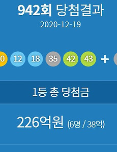 . [동행복권 로또] 20201219 942회 당첨번호 및 결과, 수령액, 판매점안내, 당첨금 수령방법 안녕하세요. 2020년 12월 19일 942회 동행복권 나눔로또의 1등 당첨자는 명6으로 38억씩 !! 가져가게 되었네요. *자료출처 - 동행복권 공식 홈페이지 | 로또는 숫자 몇개가 맞아야 당첨인가? 5등 : 숫자 3개 일치 4등 : 숫자 4개 일치 (4등까지는 세금 없음) 3등 : 숫자 5개 일치 2등 : 숫자 5개와 + 보너스 번호 1등 : 보너스를 제외한 6자리 수 모두 일치 942 회차 나눔로또 당첨결과 총 판매금액은 927억원! . . . . 10, 12, 18, 35, 42, 43 보너스 39 942 회차 나눔로또 당첨 판매점 이번 회차는 인천, 광주, 양평옥천, 익산, 창원에서 1등이 나..